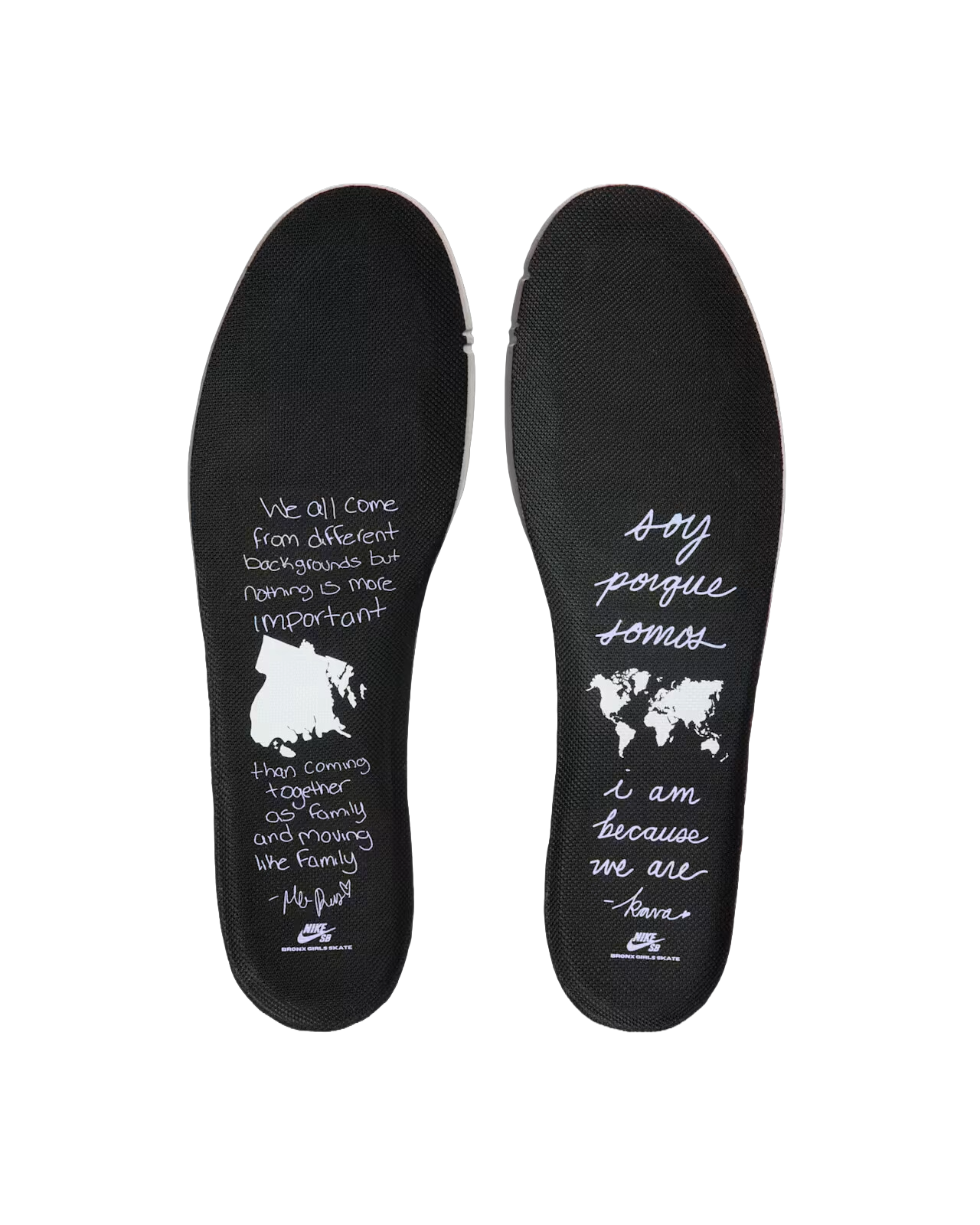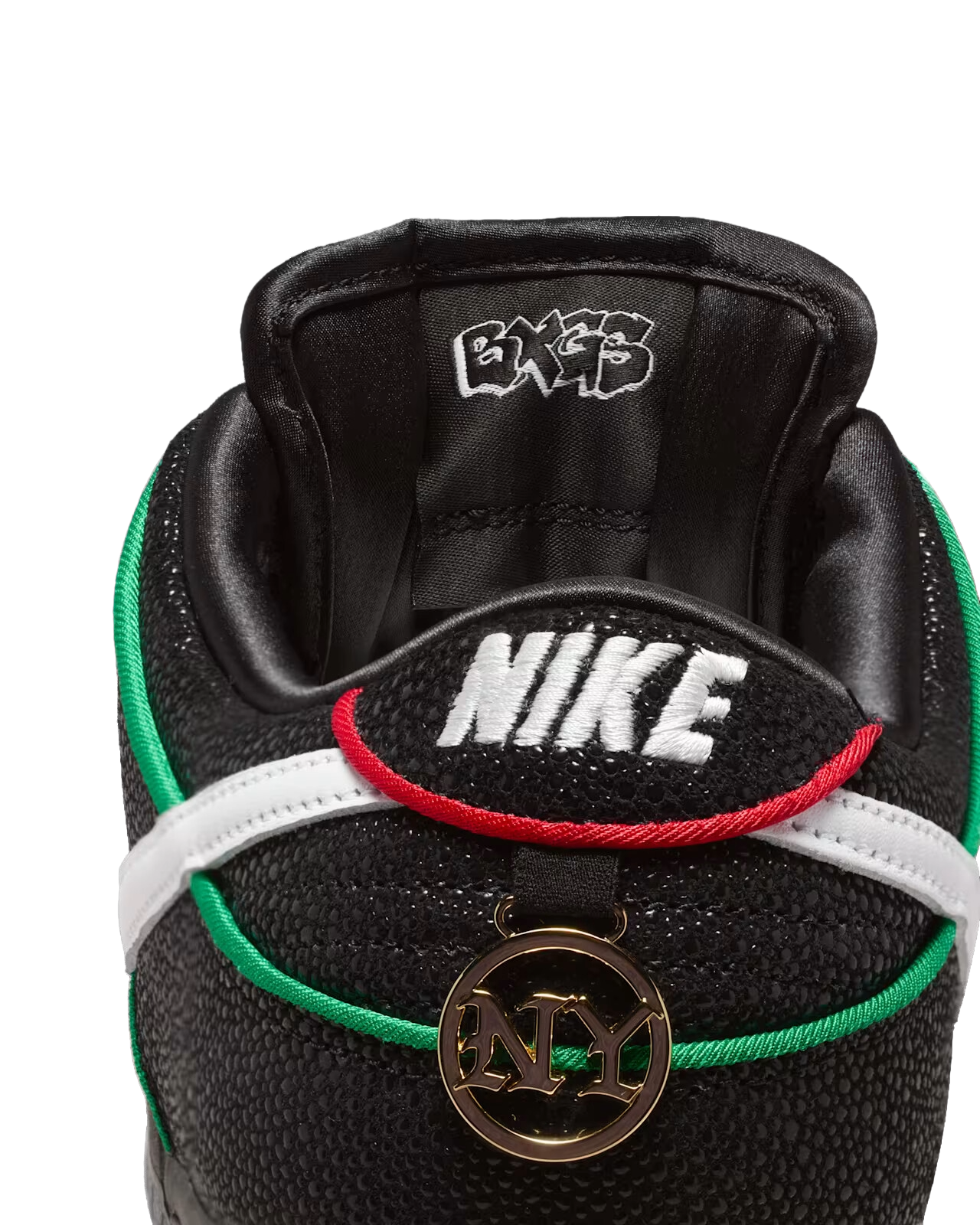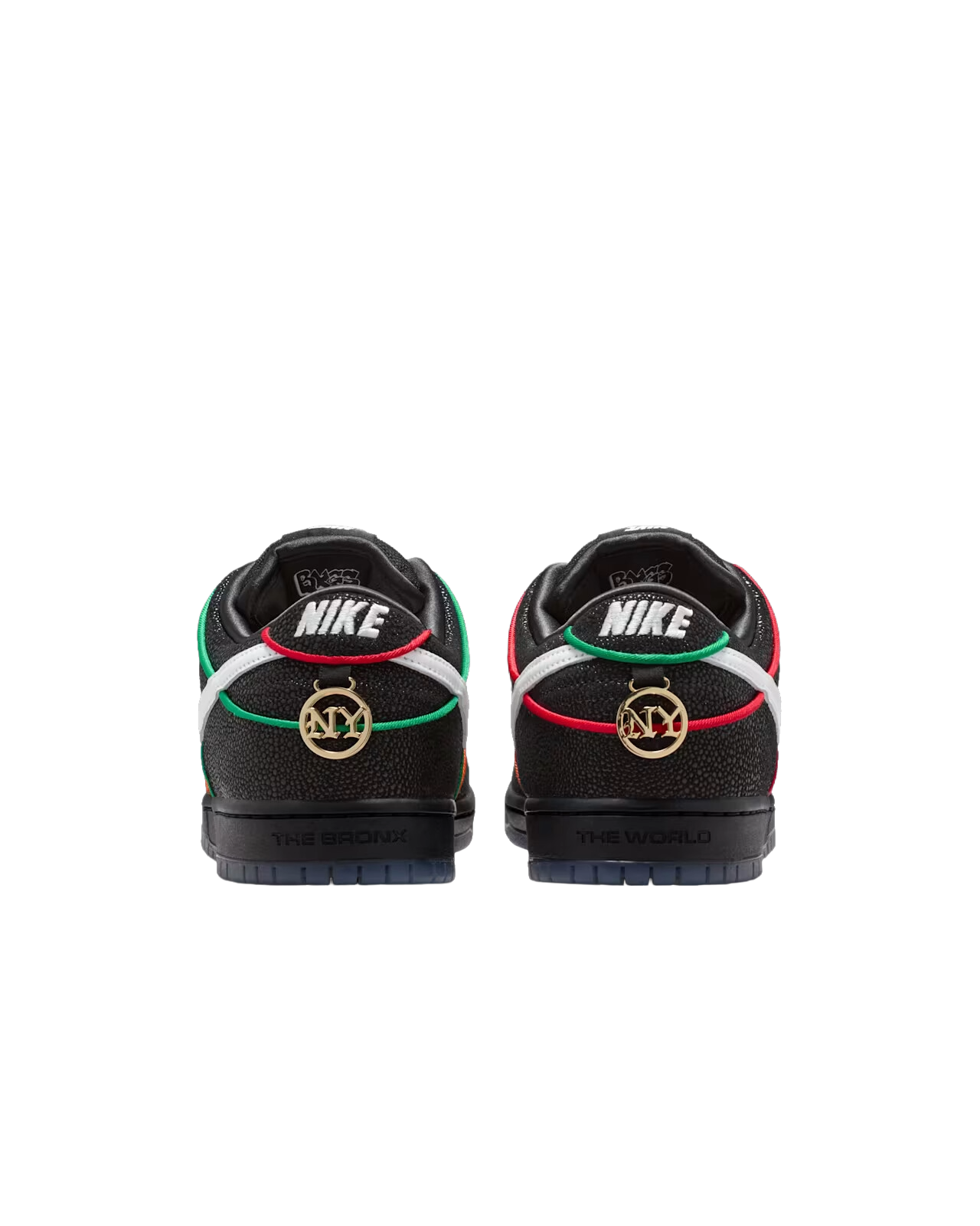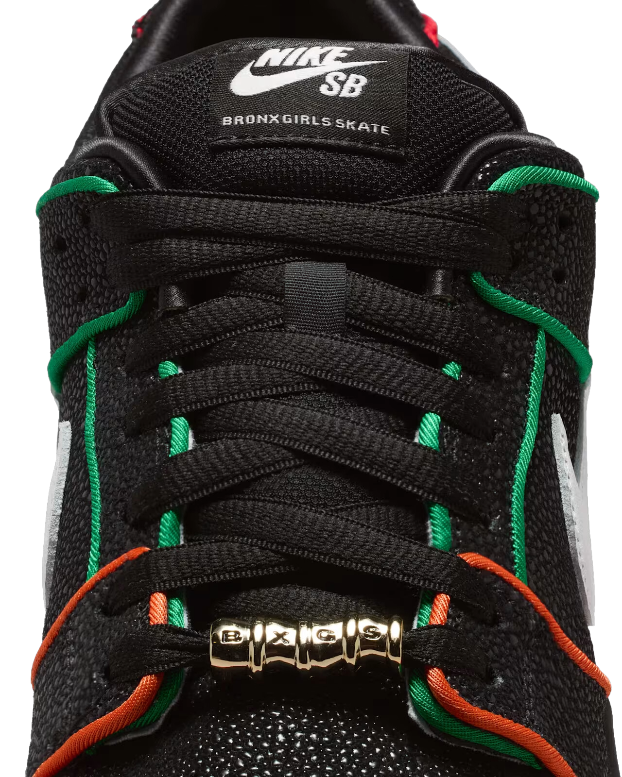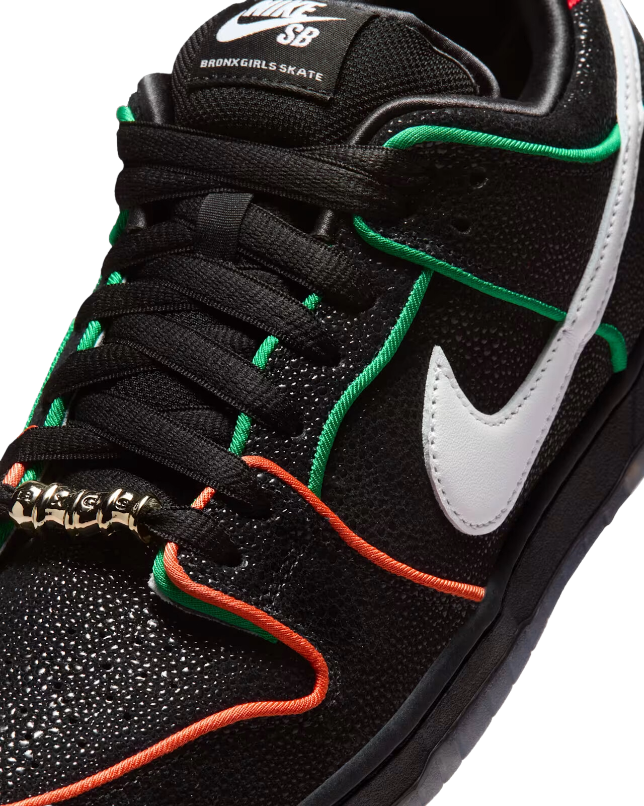 Mantenendo uno stile classico con una combinazione di colori fondamentale in bianco e nero, la Bronx Girls Skate Dunk Low è realizzata con una lussuosa pelle martellata con texture Stingray e Swoosh bianco. Riprendendo i colori delle linee ferroviarie di New York che utilizzano per spostarsi in città, le sovrapposizioni presentano bordi verdi, arancioni e rossi con tre opzioni di lacci coordinati. La suola semitrasparente continua il tema della metropolitana con grafica personalizzata, scritte graffiti BXGS e iscrizioni “The Bronx, The World” sui talloni della suola sinistra e destra. BX tutto il giorno, la Bronx Girls Skate Dunk presenta gioielli sul tallone ispirati agli orecchini a battente, dubraes coordinati con targhetta e un poetico saluto scritto da Kava e Mel sulla soletta.